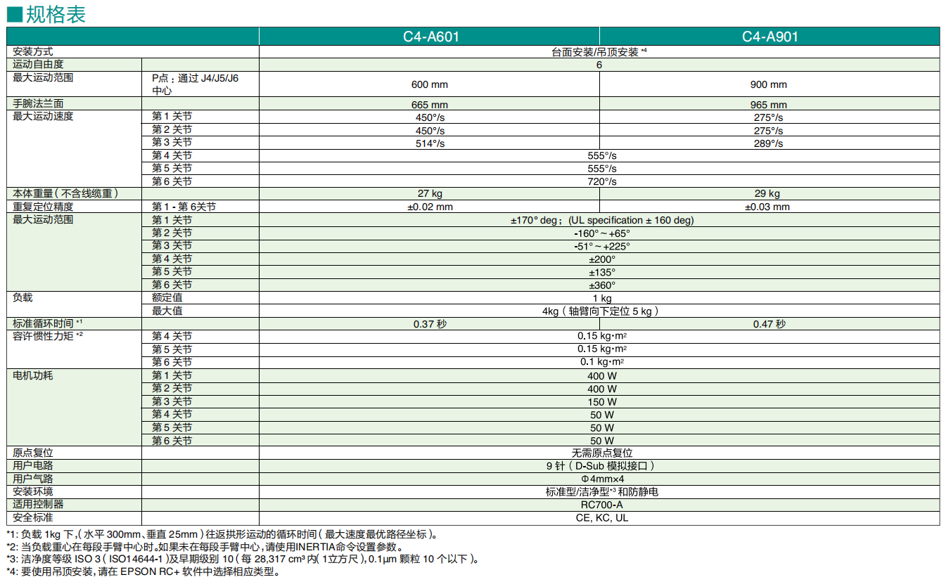 Epson ProSix C4 工作范圍600mm,有效載荷 4kg(手腕垂直向下時(shí)可以到5kg),動(dòng)力保持平穩(wěn)。通過新開發(fā)的愛普生傳感技術(shù)實(shí)現(xiàn)振動(dòng)控制。新的Epson ProSix C4L的工作范圍達(dá)到900mm,但由于機(jī)械手設(shè)計(jì)得非常細(xì)長(zhǎng),因而僅需要極少的空間,因此,在空間的充分利用這個(gè)方面,其是同類產(chǎn)品所無法比擬的!